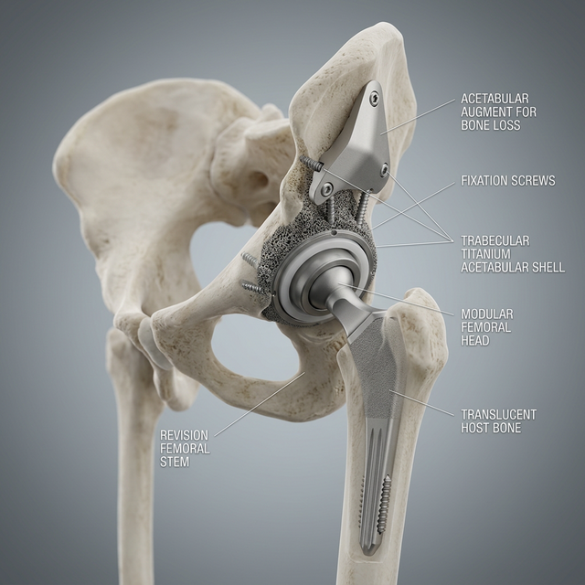 Revision hip replacement is a complex surgery to replace some or all parts of an original hip implant that has failed over time. This can occur due to mechanical loosening, 'wear and tear' of the plastic liner, recurrent dislocation, or deep infection. Dr. Ravi Teja specializes in complex reconstruction, using modular revision stems and metal augments to address bone loss. These advanced techniques provide a stable, long-lasting foundation, even in challenging anatomical situations, allowing patients to regain their mobility and comfort.