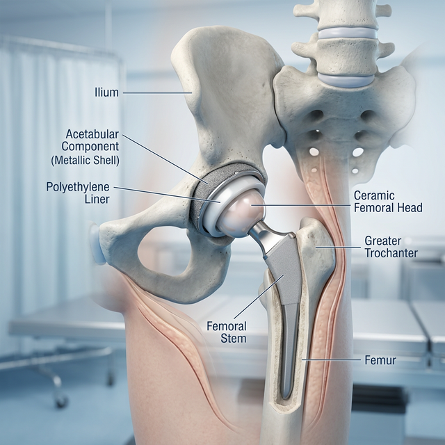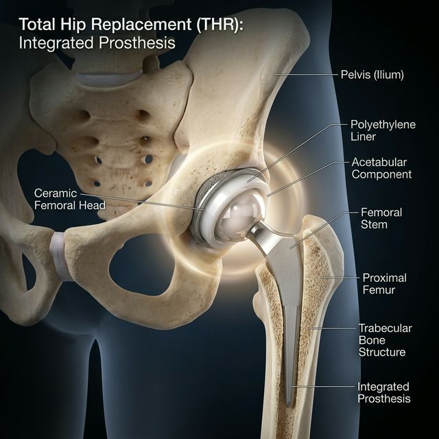 Total Hip Replacement (THR), or total hip arthroplasty, is a life-changing procedure that replaces the damaged 'ball and socket' joint of the hip with a precision-engineered prosthesis. Dr. Ravi Teja utilizes advanced materials including ceramic heads and cross-linked polyethylene liners to minimize wear and maximize longevity. This procedure removes the arthritic femoral head and reshapes the acetabular socket, replacing them with a titanium stem and a secure cup. This restoration eliminates the grinding 'bone-on-bone' pain, restores lost leg length, and allows patients to return to an active, mobile lifestyle.