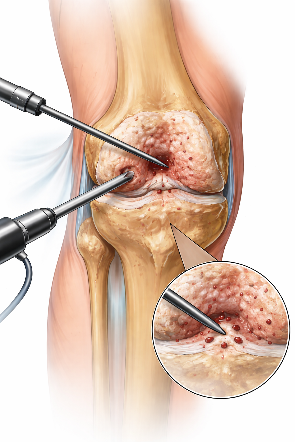 Knee Microfracture is a minimally invasive arthroscopic procedure that harnesses the body's innate regenerative capabilities to heal full-thickness cartilage defects. By creating tiny holes (3-4mm apart) in the exposed bone, we release stem cells that form a marrow-enriched 'super-clot'. Over time, this clot matures into a smooth, durable hybrid of articular-like cartilage and fibrocartilage, significantly reducing pain and swelling while improving joint mobility for focal 'craters' typically less than 2cm² in size.